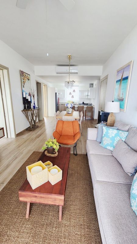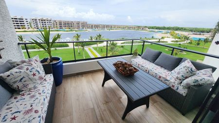 El apartamento cuenta con una superficie de 89 m2 y está ubicado en el 4to nivel, con un espectacular balcón que ofrece vistas a la playa artificial y a la zona social del complejo. Posee una excelente distribución y decoración de buen gusto, con una amplia sala-comedor, una cocina abierta con desayunador, 2 dormitorios y 2 baños, además de un área de lavado.
