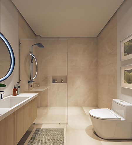 Baños modernos con cerámica importada, mamparas de cristal y luminarias LED