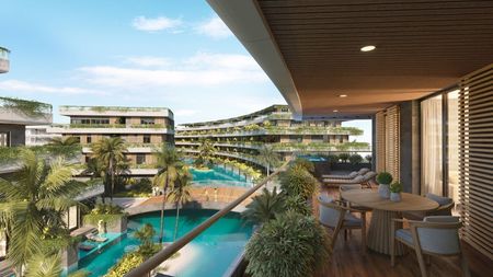 Se divide en 4 bloques los cuales tienen apartamentos de 1 y 2 habitaciones con vistas a la playa artificial y apartamentos estudios en la parte trasera que da vista a la piscina. En total cuenta con 264 Unidades.