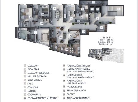 3 habitaciones, principal con baño y walk in closet, habitación 2 con baño y closet y habitación 3 con baño con walk in closet, family/ estar, terraza/ balcón , closet, aires acondicionados, hall de entrada, baño de visitas, sala, comedor, estudio, cocina fría, cocina caliente y lavado.