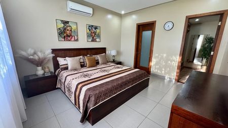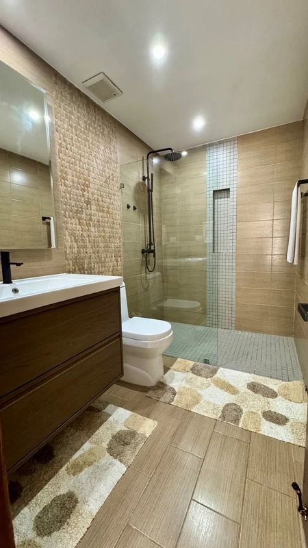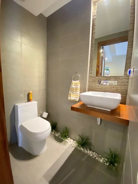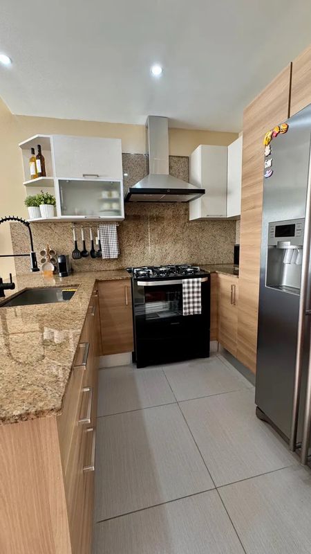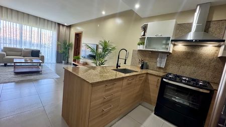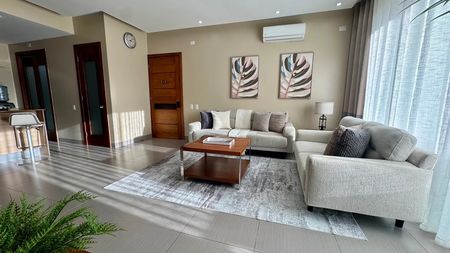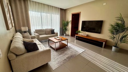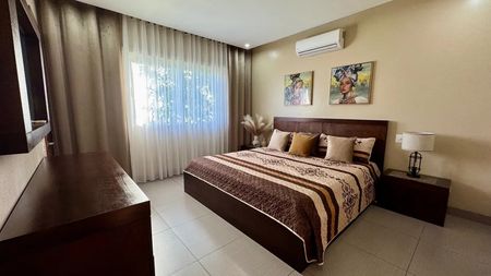 Está totalmente amueblado con mueble moderno y cómodo . Cama de tamaño King, sofás, alfombras, sillas de barra, decoraciones.