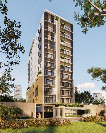Se trata de una torre de apartamentos de 12 niveles con 4 apartamentos por nivel. Cada apartamento cuenta con 1 habitación, 1.5 baños y 1 parqueo.