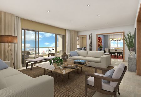 Climatización en áreas sociales y habitaciones - Ventanas y puertas de aluminio y vidrio importadas con doble vidrio insulados - Pisos de mármol en áreas sociales y habitaciones - Baños en mármol - Duchas con cierre en cristal templado - Cocinas modulares importadas - Topes en granito natural - Pisos de porcelanato de primera calidad en cocina y áreas de servicio Techos en yeso y/o sheetrock - Aparatos sanitarios y griferías importadas de primera calidad.