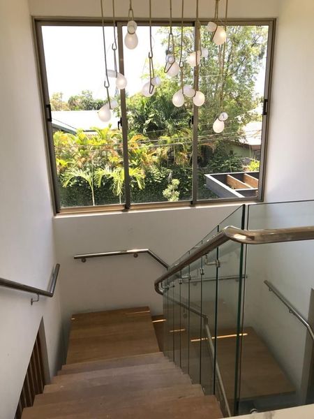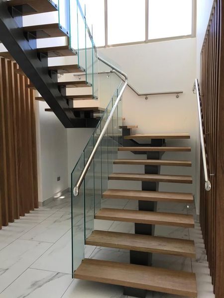 Escalera Moderna Tipo industrial, en hierro, madera y cristal Templado Flotante,