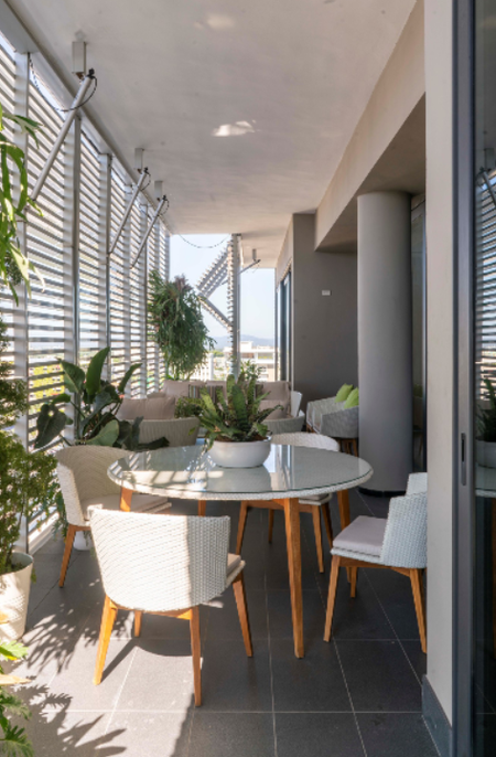 Vestido por una piel de doble fachada de persianas operables en aluminio que controlan de luz solar e incrementan el estado de bienestar en los espacios interiores.