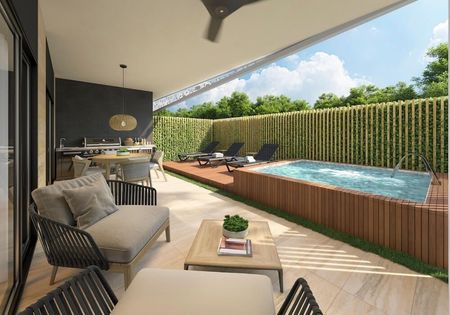 • Flat Pool con 15 metros lineales disponibles para tanning ledge. • Pool Bar. • Lounge - Solarium. • Gym totalmente equipado. • Exterior Putting Green. • 2 Grandes Salas de Estar Techadas. • Rooftop para Adultos con 2 Jacuzzis y Lounge Solarium. • Baños para Damas y Caballeros.