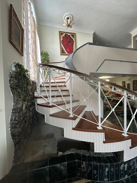 Al ingresar, un recibidor de doble altura conecta con tres salas de diseño exclusivo, donde destaca una espectacular cascada bajo la escalera. El comedor y el bar integran elegancia y funcionalidad para recibir invitados.