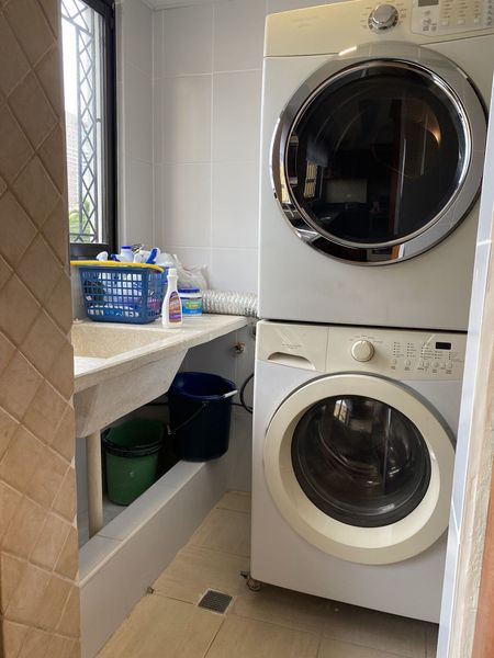 El apartamento cuenta con una distribución ideal que incluye una sala de generosas proporciones, un comedor perfecto para reuniones, un desayunador para momentos informales y una cocina totalmente equipada. El pasillo conduce a un área de lavado independiente y a un cuarto de servicio completo con su propio baño.
