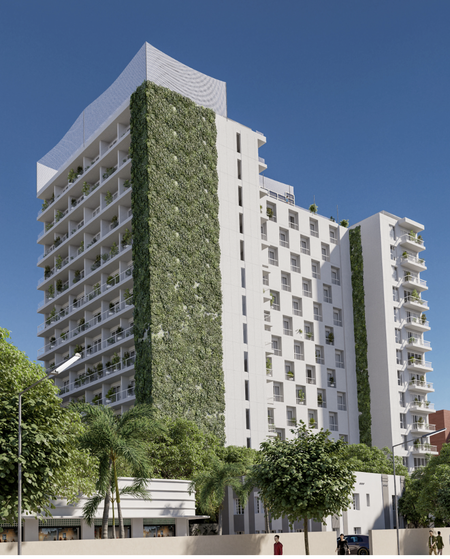 Con una arquitectura vanguardista y un diseño en forma de L sobre un solar de 3,276.44 m², el proyecto ofrece 276 apartamentos funcionales y modernos distribuidos en 14 niveles.