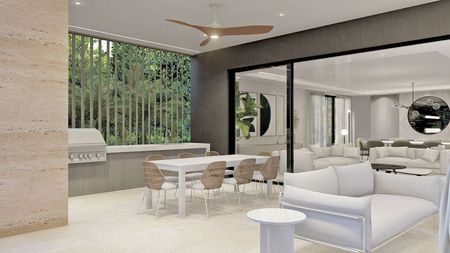 • Las áreas al exterior de sofás, comedor exterior con área de barbacoa y piscina.